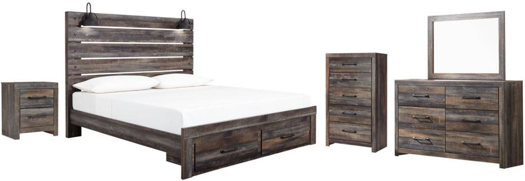 Includes king-size panel bed (headboard, 2-drawer storage footboard and rails), 6-drawer dresser with mirror, 5-drawer chest and 2-drawer nightstand