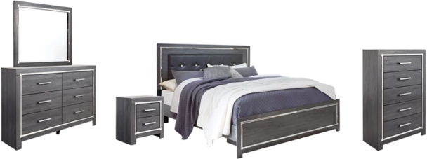 Includes panel bed (headboard, footboard and rails), 6-drawer dresser with mirror, 5-drawer chest and 2-drawer nightstand