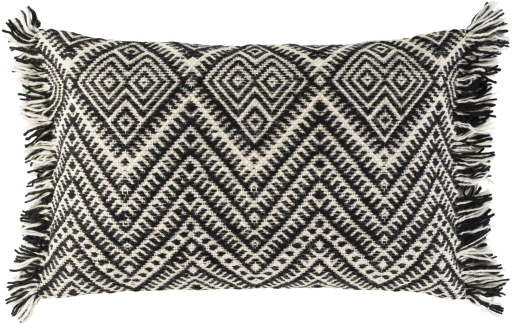 The Katniss Black 22" x 14" Toss Pillow from Surya features a down insert, fringe-edge design, and is made in India.