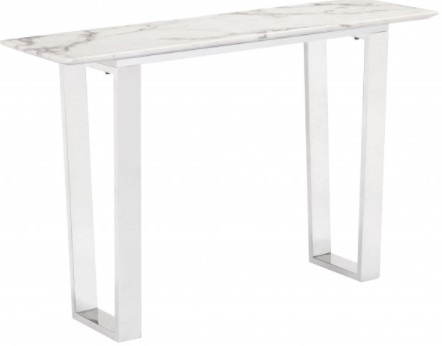 On-trend and decidedly modern, this sophisticated console table will be on every designers list. Gorgeous from every angle, the rectangular faux marble top seems to float atop its simple brushed silver base. Long and narrow to fit in most spaces. Pair with the Atlas dining table, side table and coffee table.Read More