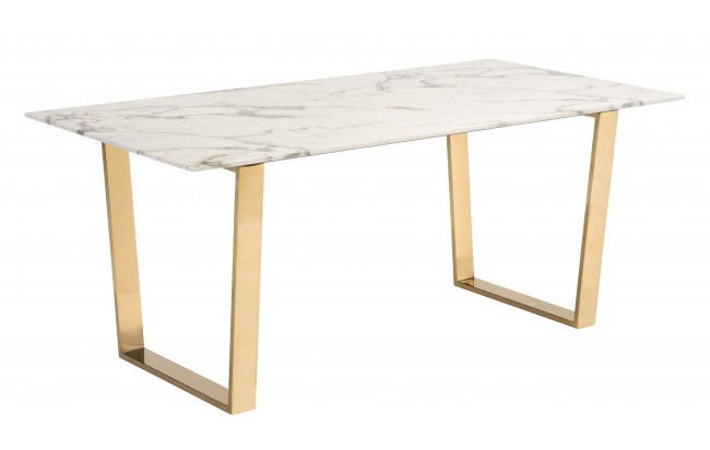 On-trend and decidedly modern, this sophisticated dining table will be on every designers list. Gorgeous from every angle, the rectangular faux marble top seems to float atop its simple gold geometric base.Read More